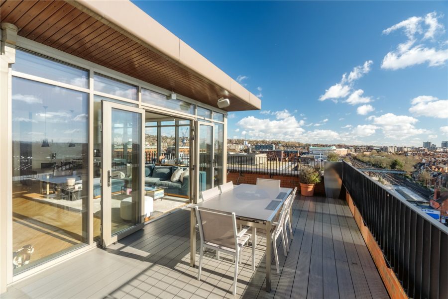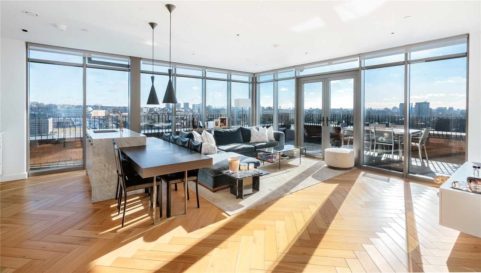 The property itself has been finished to a high specification throughout with a practical modern layout comprising a spacious open-plan reception room and kitchen with access to a 600 sq.ft. plus South facing, wrap-around terrace, a large principal double bedroom with en-suite, two further double bedrooms and family bathroom. All three bedrooms also have direct access to the terrace which offers stunning views of the London skyline as well as excellent entertaining space.