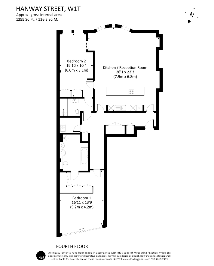 A well-proportioned two-bedroom apartment spanning 1,359 sq. ft., located on the fourth floor of a newly built, portered development within the Hanway Street Conservation Area in Fitzrovia.