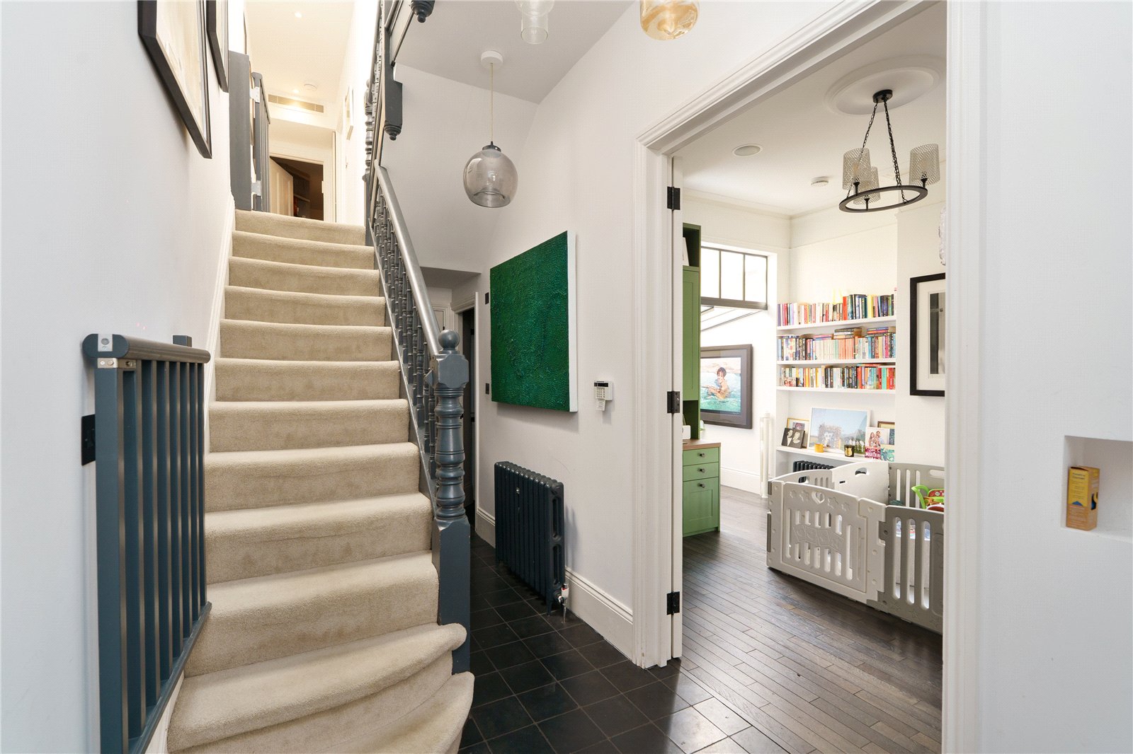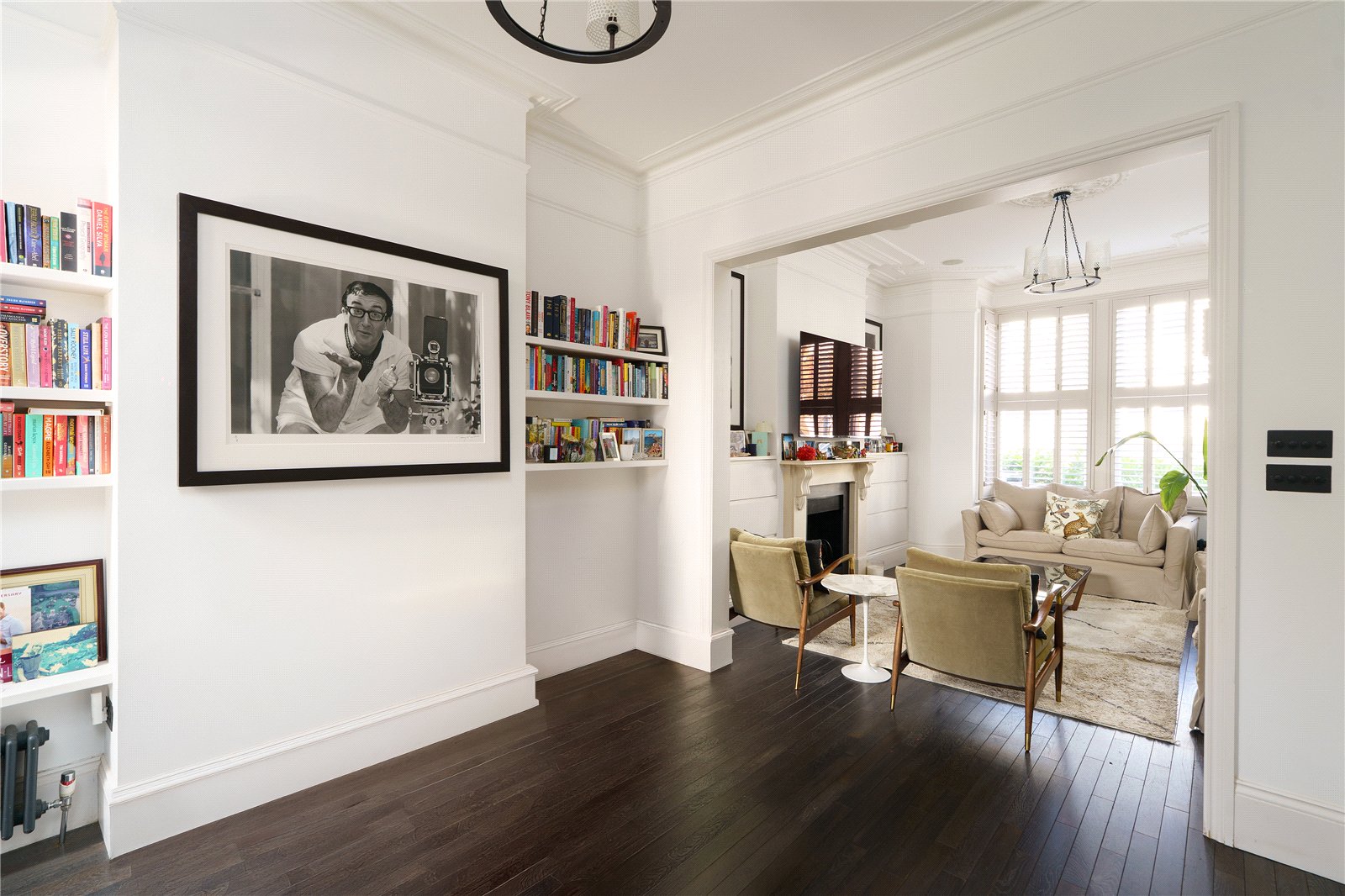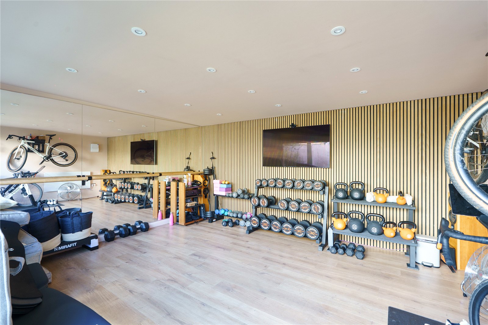 The ground floor is an entertainer’s dream with a double living room with gas fireplace, built-in Sonos Speakers including a bespoke fitted study, leading to the heart of the home, the contemporary open-plan kitchen. The kitchen area comprises Miele appliances with an extra-large island and breakfast bar, including a dining room with floor-to-ceiling Crittall glass doors, offering beautiful natural light and ideal indoor outdoor living, opening to the landscaped South facing garden. At the rear of the garden is a newly built modern garden studio, currently utilised as a professional home gym. A newly renovated WC, organised laundry room and boot room is situated under the staircase.