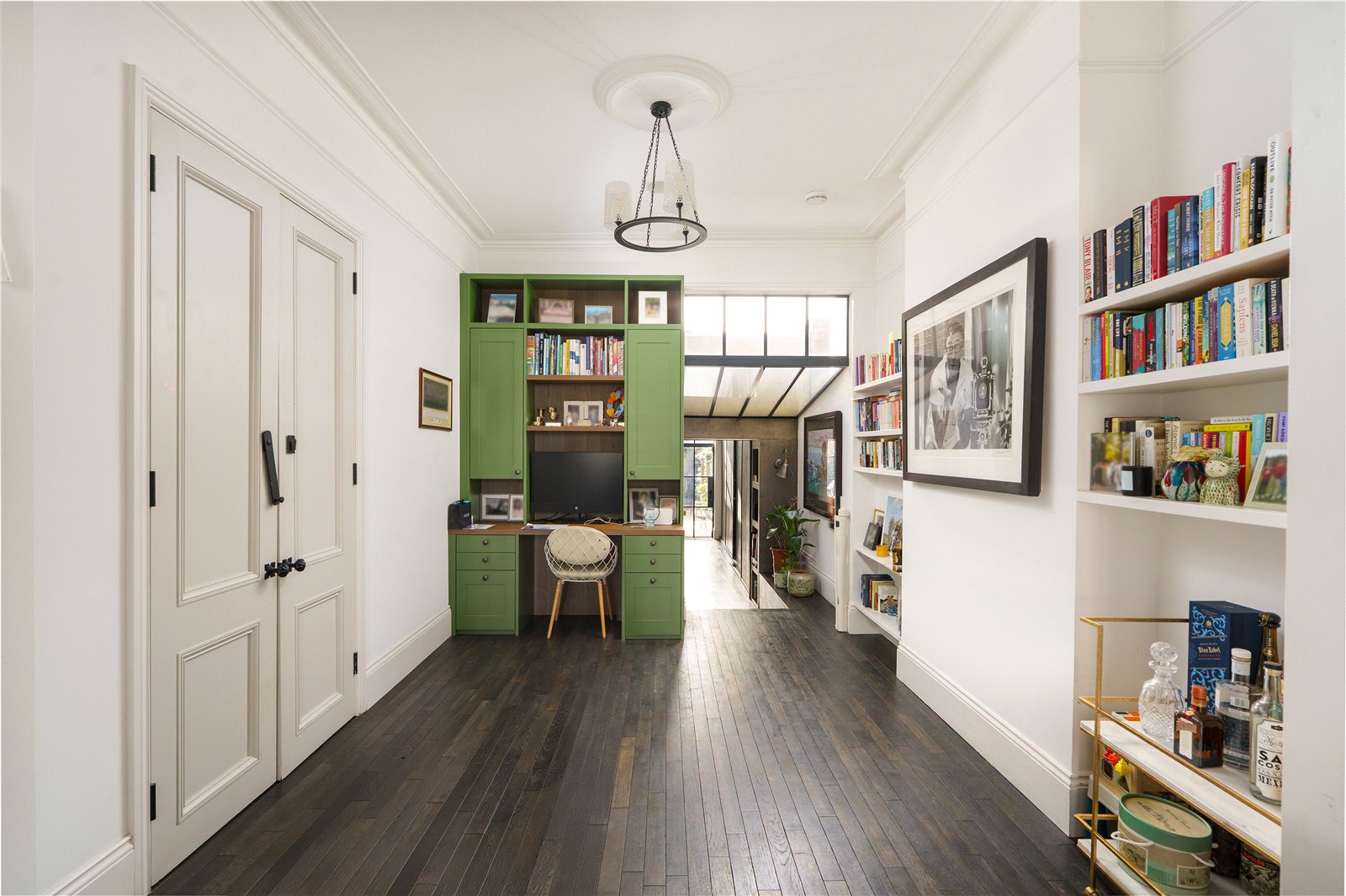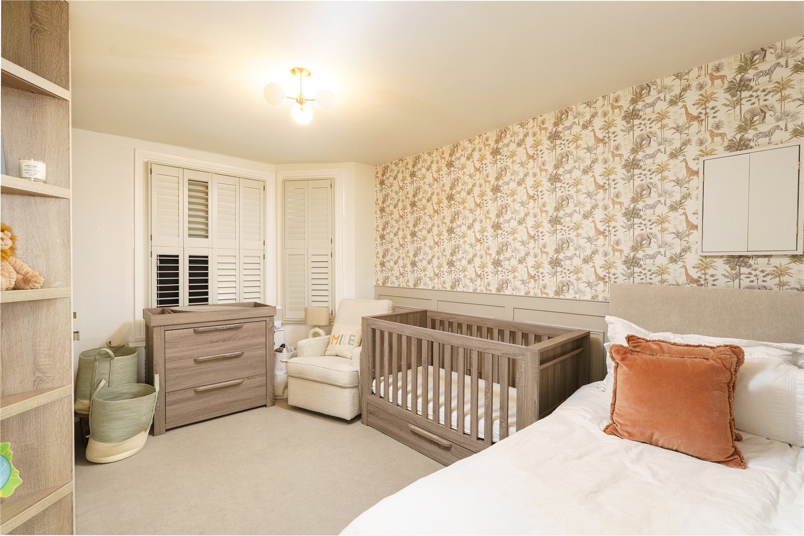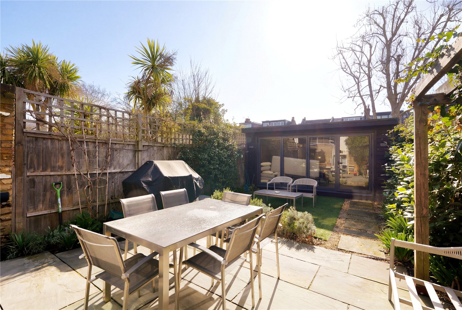 The ground floor is an entertainer’s dream with a double living room with gas fireplace, built-in Sonos Speakers including a bespoke fitted study, leading to the heart of the home, the contemporary open-plan kitchen. The kitchen area comprises Miele appliances with an extra-large island and breakfast bar, including a dining room with floor-to-ceiling Crittall glass doors, offering beautiful natural light and ideal indoor outdoor living, opening to the landscaped South facing garden. At the rear of the garden is a newly built modern garden studio, currently utilised as a professional home gym. A newly renovated WC, organised laundry room and boot room is situated under the staircase.