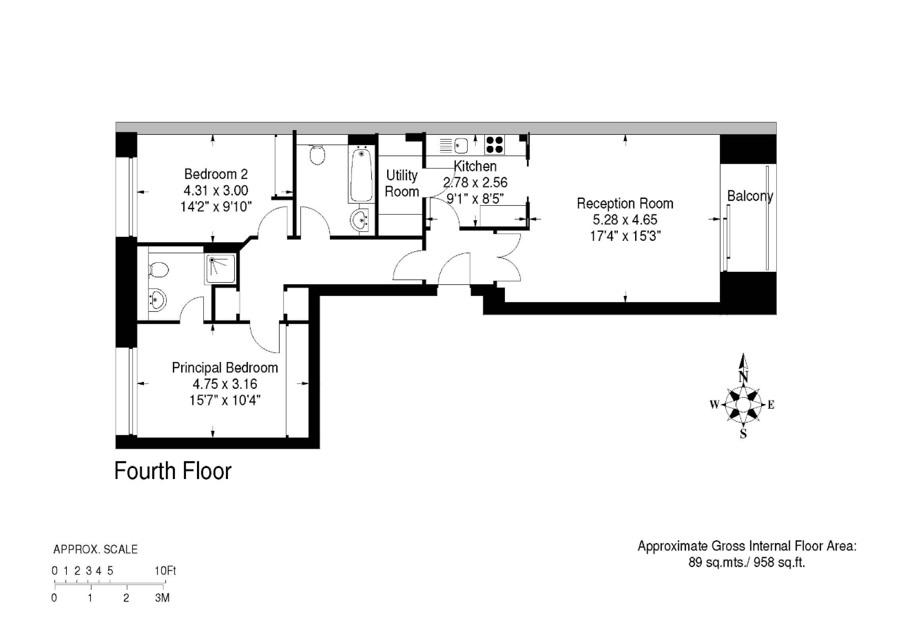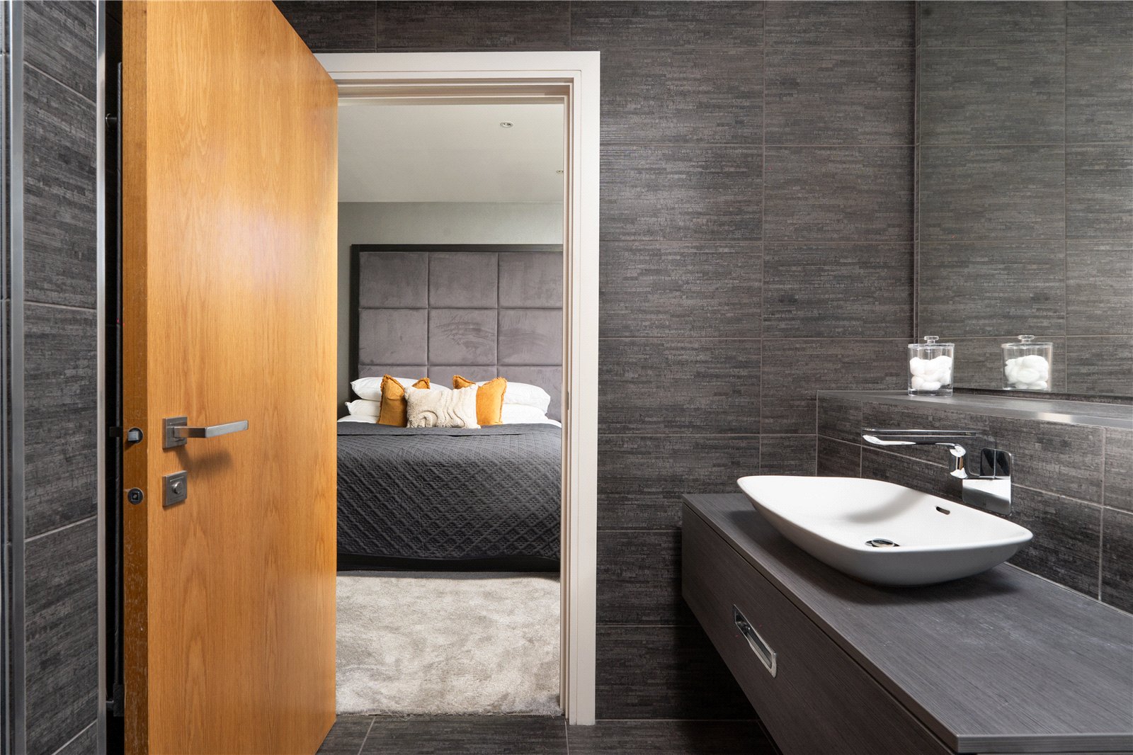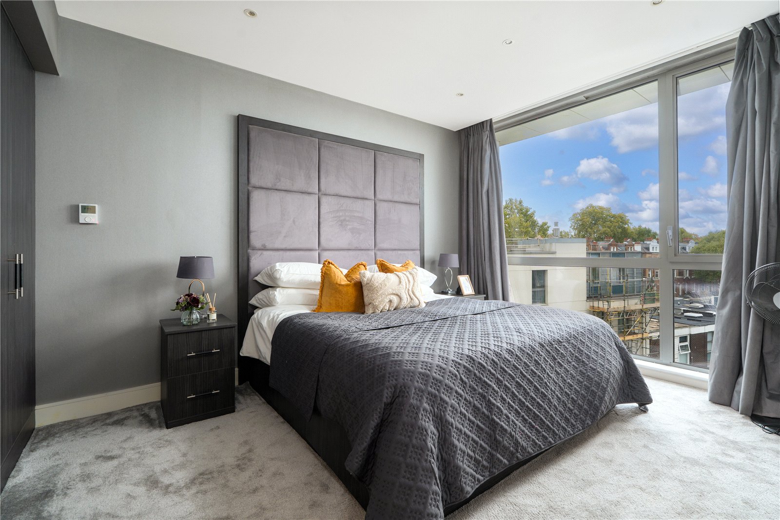 Set on the fourth floor of a recently constructed purpose built block this two bedroom, two bathroom apartment benefits from an abundance of natural light. Spanning approximately 958 sq. ft, the property offers ample living space and large bedrooms. The property comprises a large reception room, with a private balcony and pocket doors to the kitchen giving you the option of a separate, or open plan space. At the back of the building you have a large principal bedroom offering exceptional storage, and en-suite shower room. The second bedroom is also generously sized, with fantastic built in wardrobes. There is also a family bathroom and an additional utility room. Further benefits include air conditioning throughout, underground parking and a 24 hour porter.