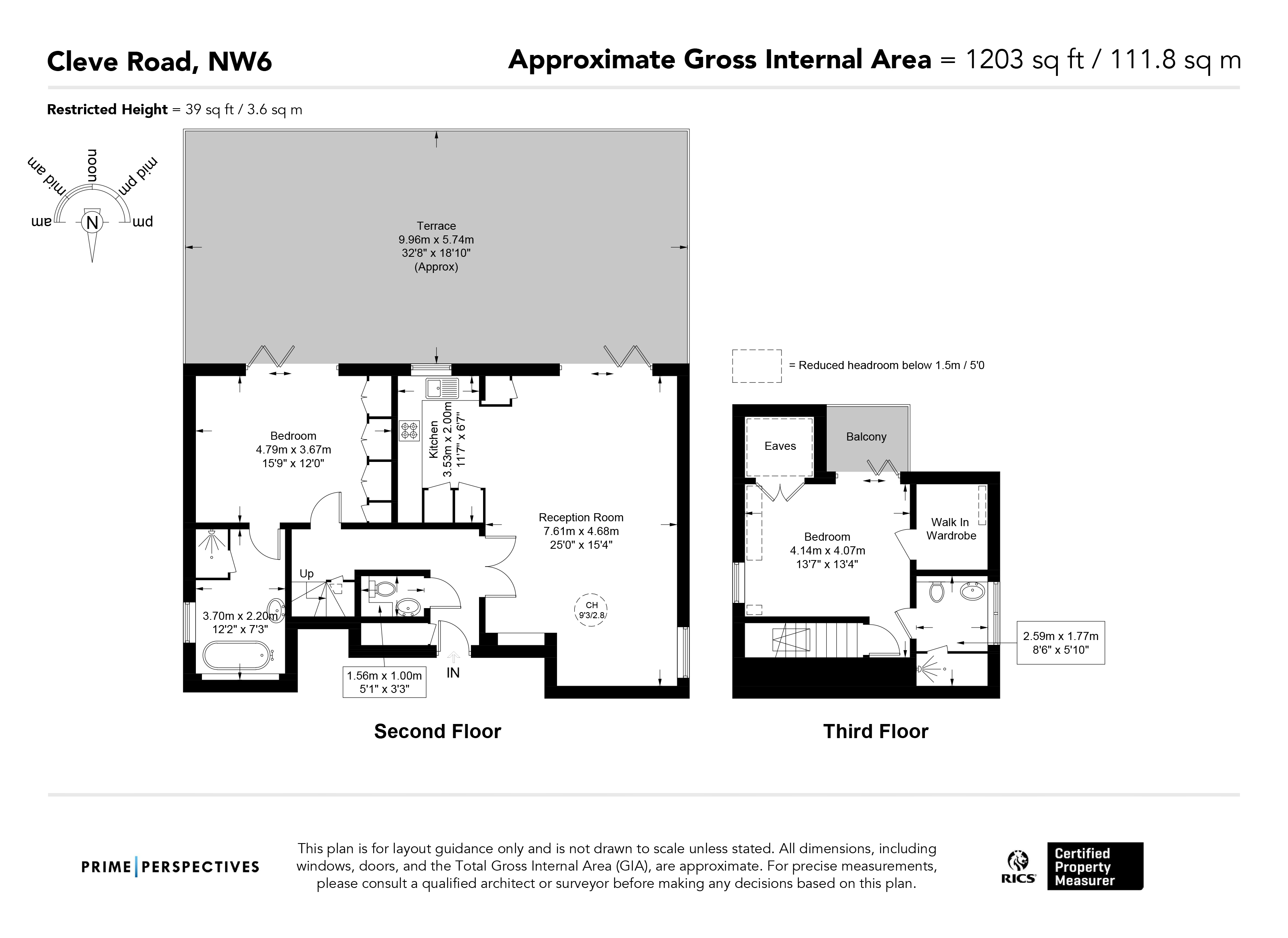 The principal suite includes extensive fitted wardrobes, a large en-suite bathroom and direct terrace access. Upstairs, the second bedroom has its own balcony, walk-in wardrobe and shower room, plus additional eaves storage. A guest WC sits off the hall, and residents share landscaped communal gardens.